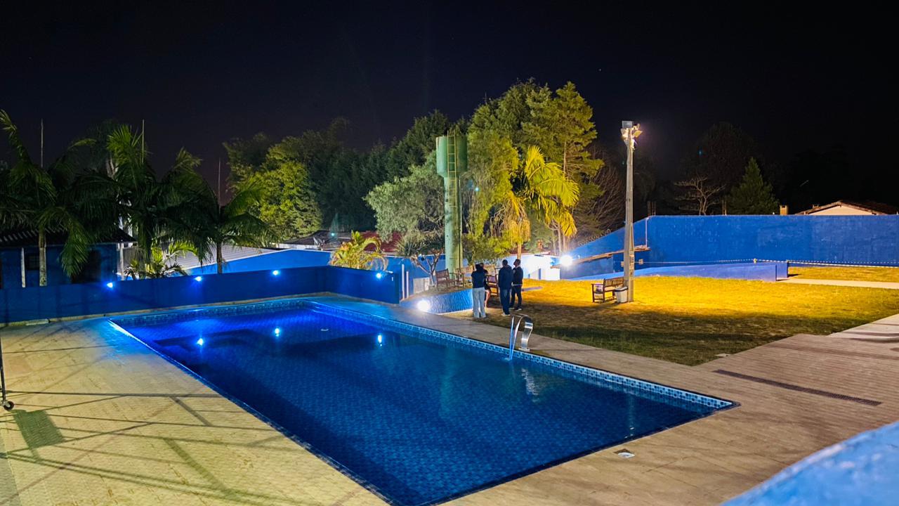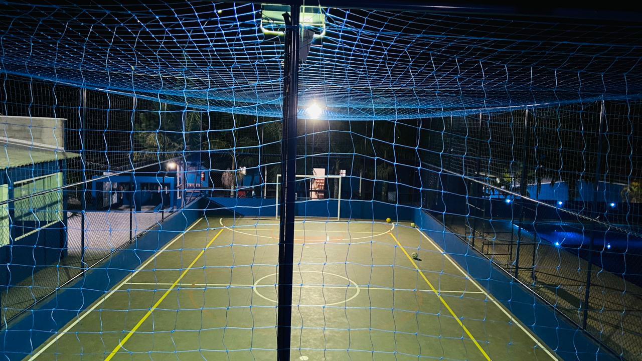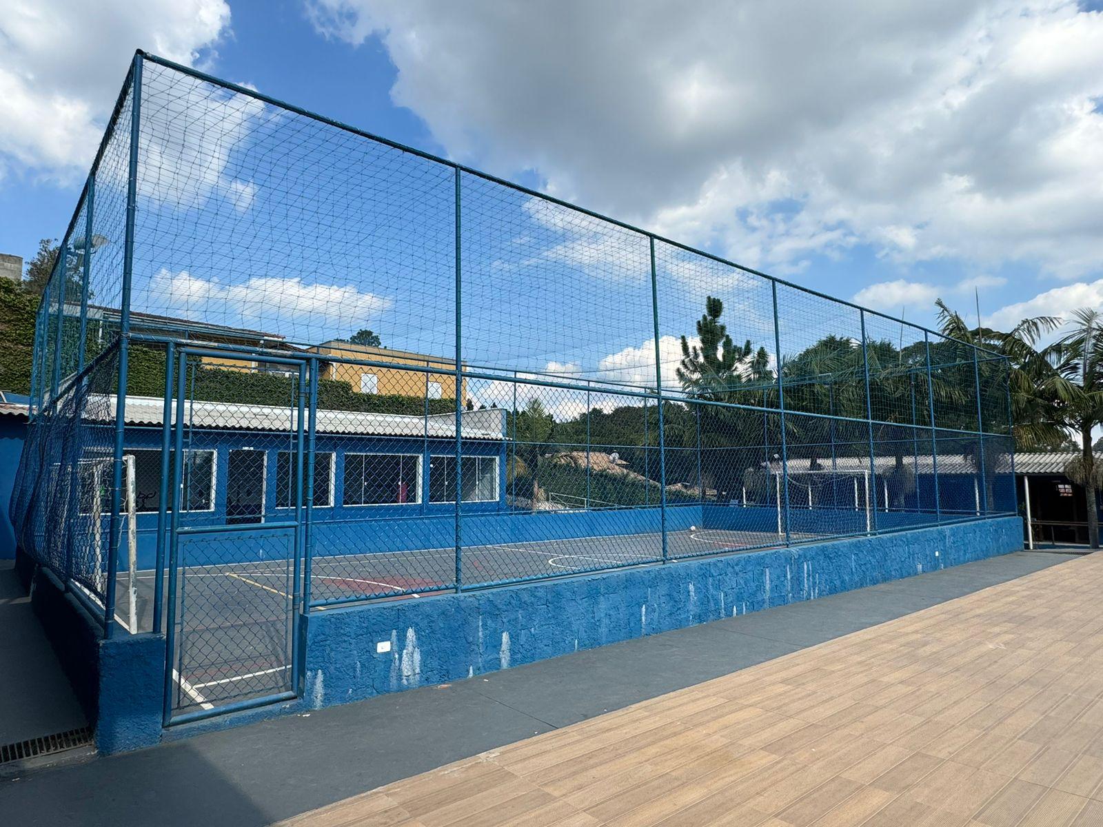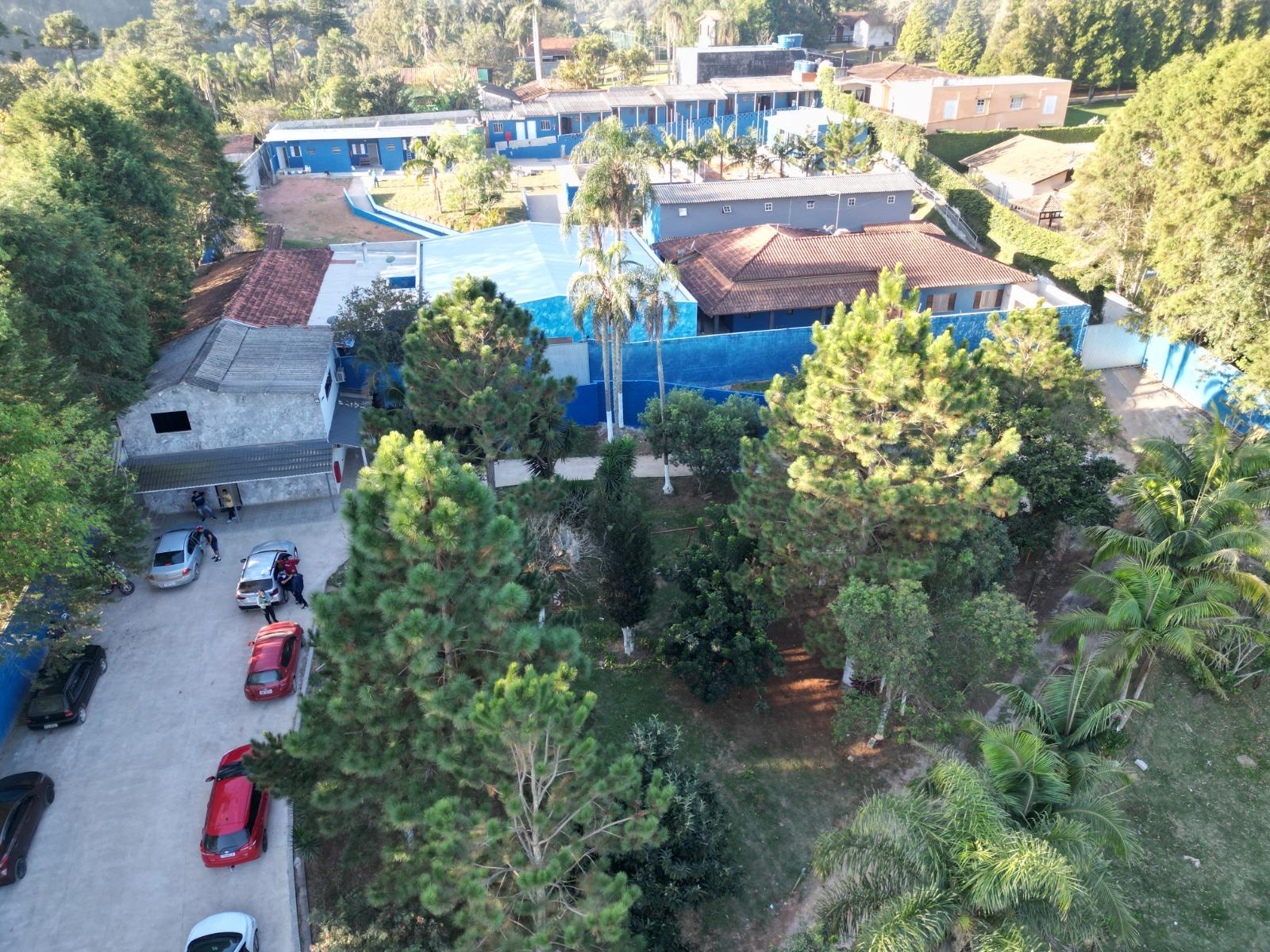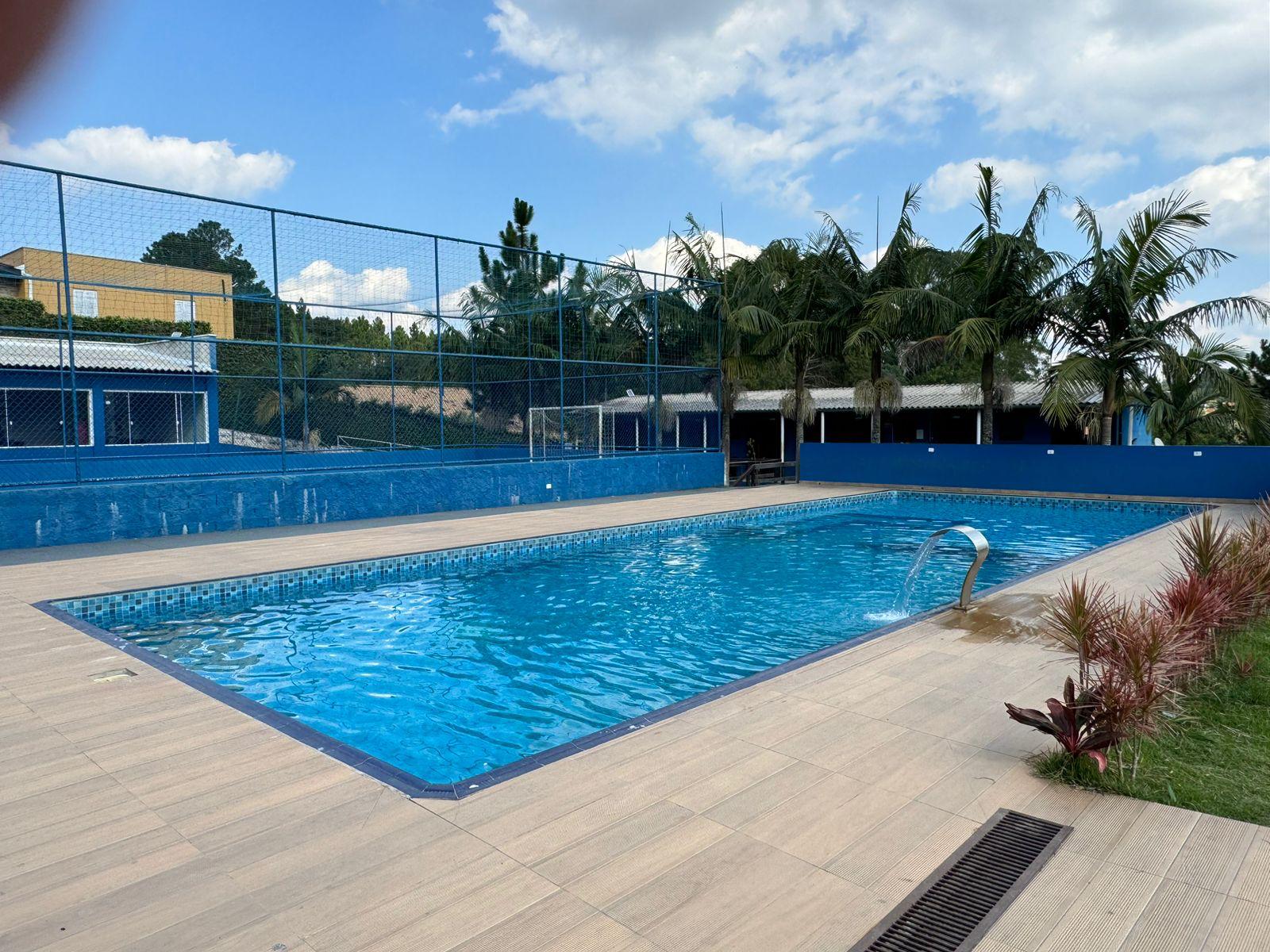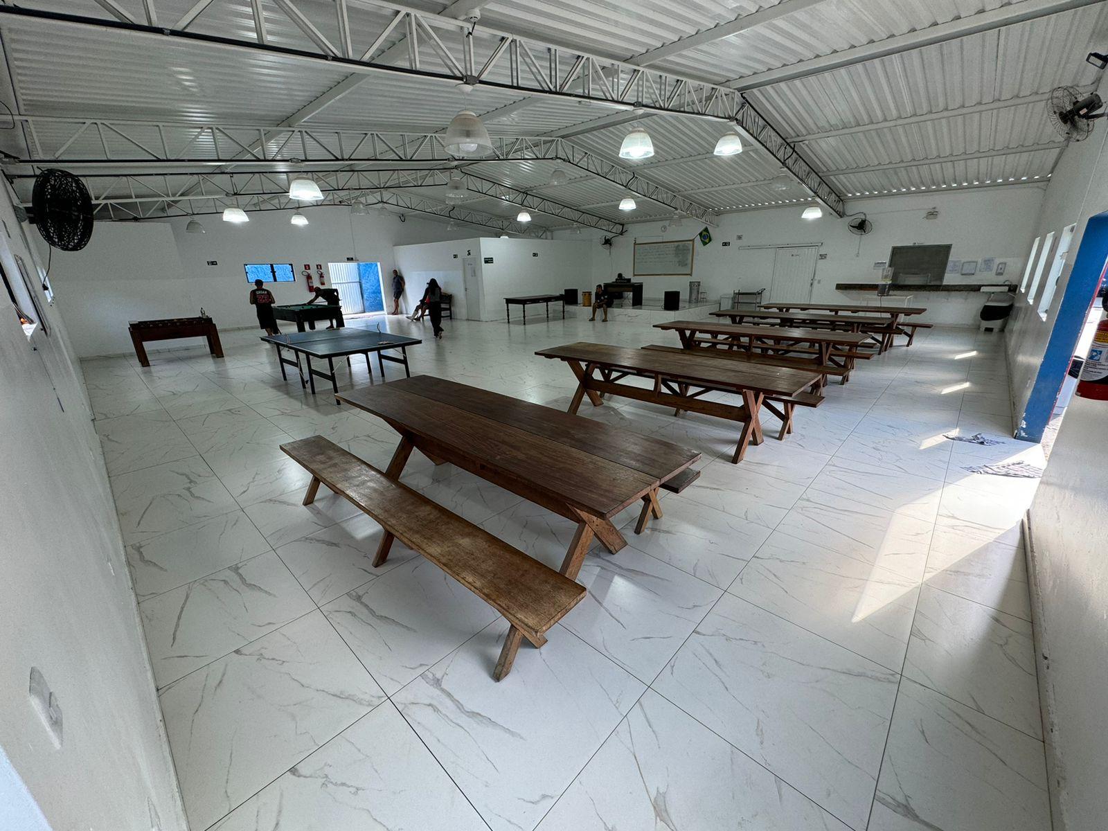 Ambientes equipados com piscina, academia, campo e quadra para esportes, refeitório, além de uma área ampla.