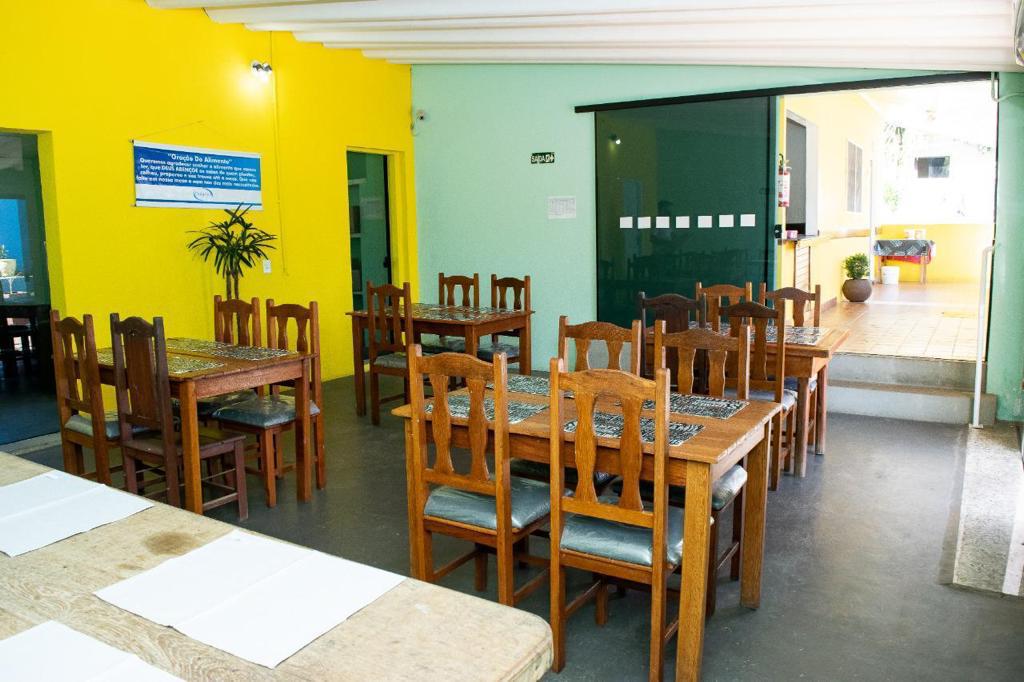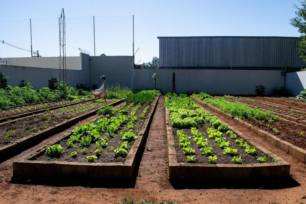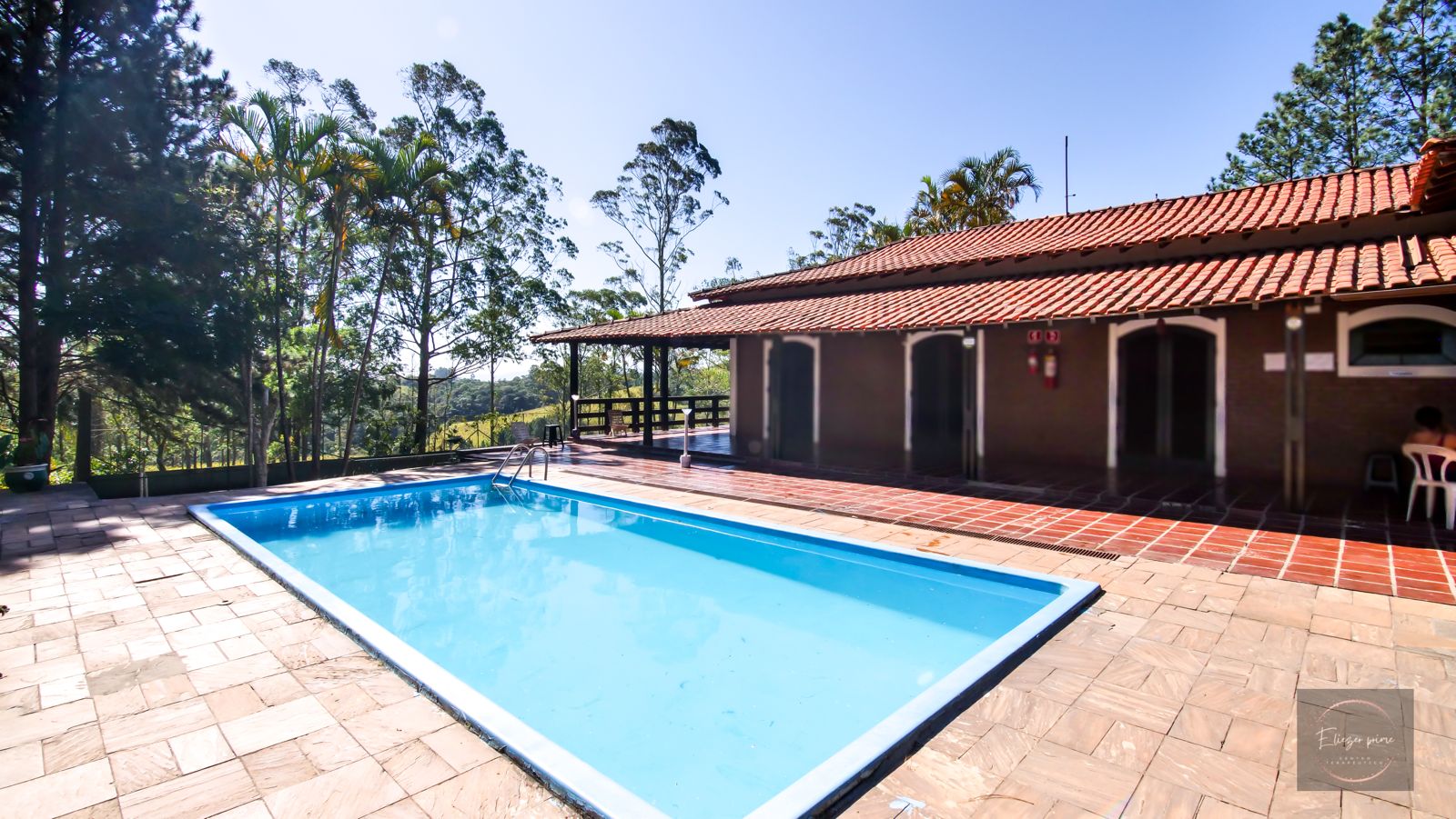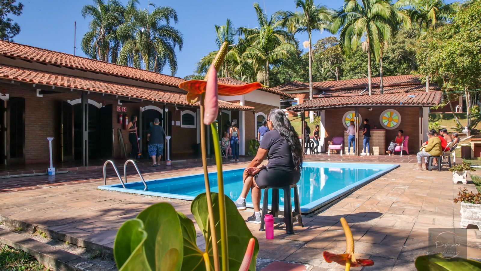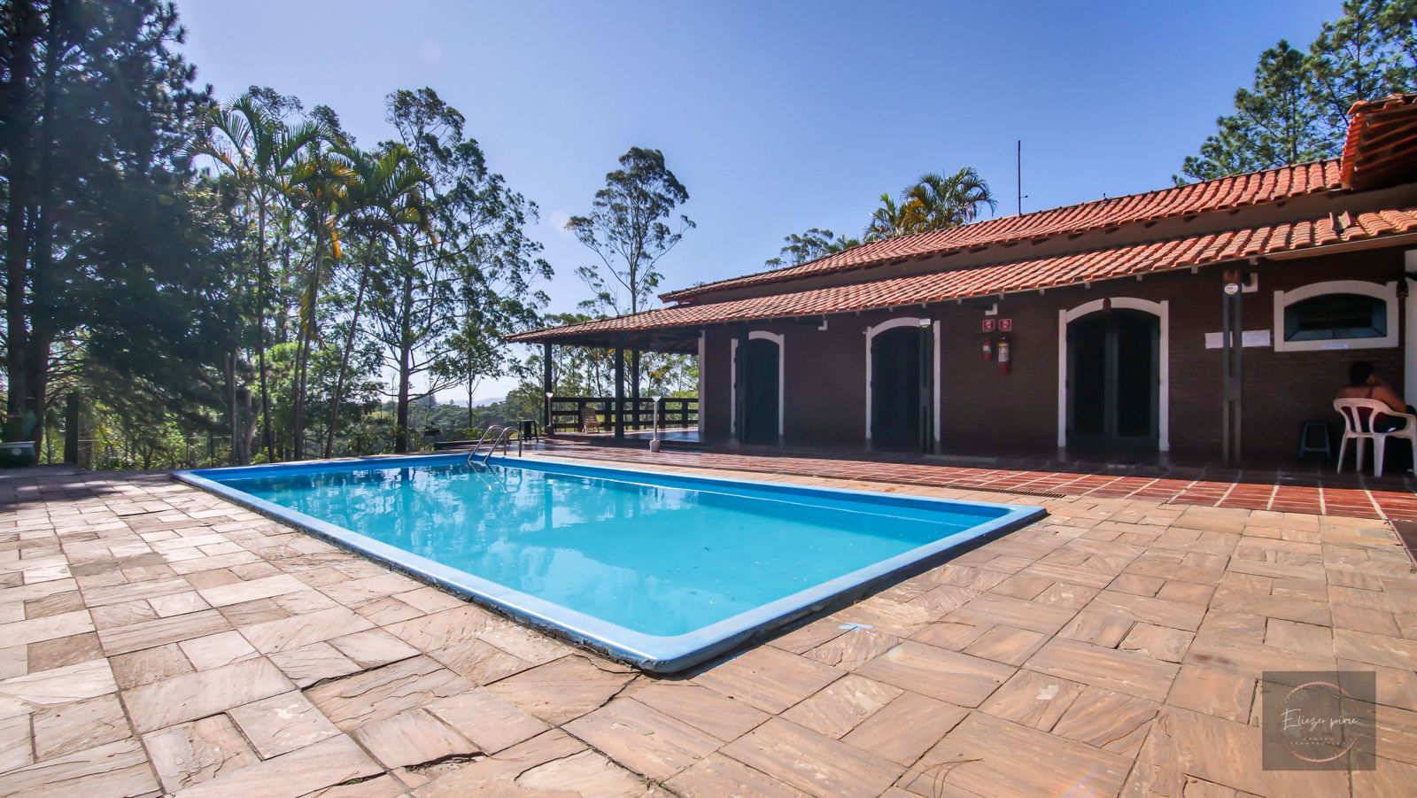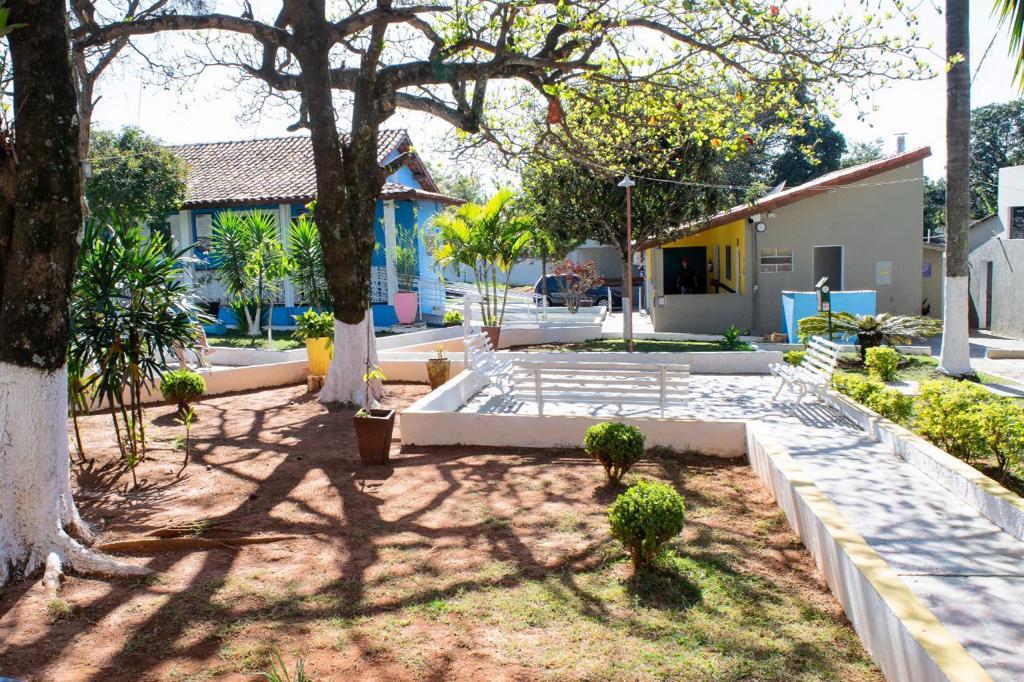 Ambientes equipados com piscina, academia, campo e quadra para esportes, refeitório, além de uma área ampla.